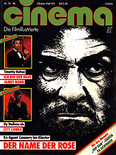 | Name: cinema plus Das Magazin Erscheinungsdatum: Oktober? 1986 Zahl der Seiten zum Thema; Die Artikel: Superbe, oft über mehrere Seiten bebildert findet man hier u.a. ein Interview mit Sean Connery (4 Seiten); Informationen zu den geschichtlichen Hintergründen des Buchs/Films / zur Entstehung des Films / zum Kult um die Rose (6 Seiten); ein Interview mit Umberto Eco (2 Seiten); ein Interview mit bzw. ausführliche Informationen zum Produzenten Bernd Eichinger (6 Seiten). Weiterhin gibt es einen ausführlichen geschichtlichen Abriss über den Entstehungsort der Außen- sowie der Labyrinths-Aufnahmen. Er nennt sich Cinecittà, liegt vor den Toren Roms und hier sind schon zahlreiche große (meist monumentale) Filme entstanden. Der Hauptautor, Peter Berling, hat im Film übrigens eine kleine Rolle als päpstlicher Würdenträger bekleidet. Fast schon ein Sonderheft nur zum Film! |